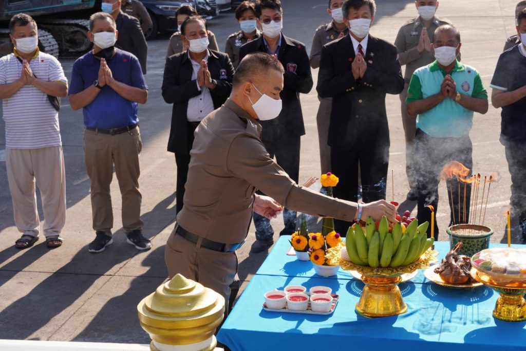 พิธีบวงสรวงเจ้าที่เพื่อจัดทำเสาธงใหม่ ณ ลานหน้าเสาธง บก.น.8